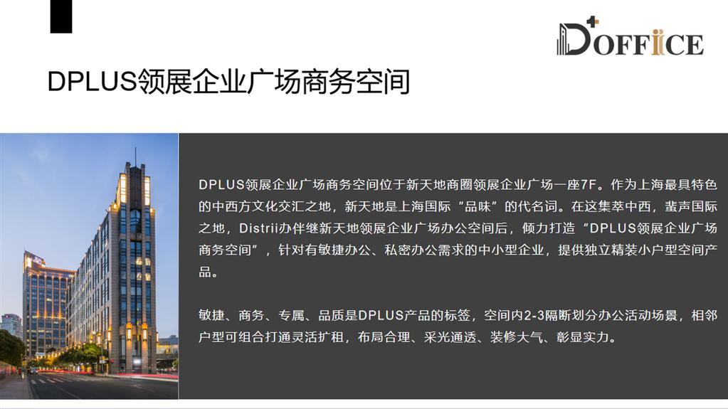 DPLUS領(lǐng)展企業(yè)廣場(chǎng)商務(wù)空間位于新天地商圈領(lǐng)展企業(yè)廣場(chǎng)一座7F。作為上海最具特色