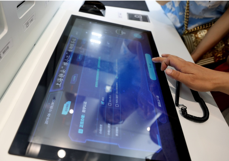 6月10日,在上海市靜安區(qū)越洋廣場寫字樓內(nèi)的靜安“樓小二”自助服務(wù)站,企業(yè)工作人員在了解自助辦理的相關(guān)內(nèi)容。