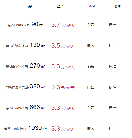 慧谷白貓科技園辦公室出租及租金