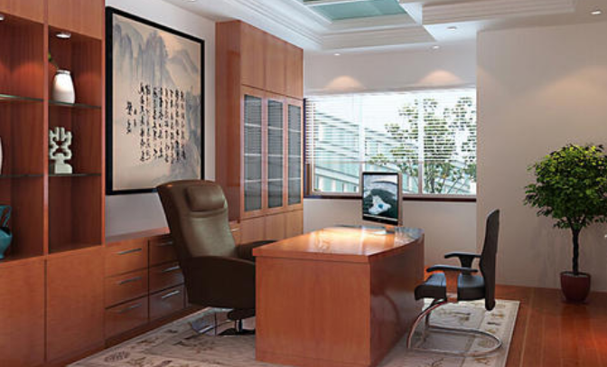 人坐在辦公桌后,背后要有靠,這個靠可以是墻壁,也可以是比較大的柜子,最忌背后是門。如果背后是通透的窗戶,就要把窗戶進(jìn)行遮檔,背后的裝飾畫也要以靜態(tài)的山、樹等為好。