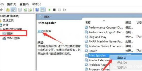 換到”計(jì)算機(jī)管理“一"服務(wù)”選項(xiàng)卡,找到“Pr i n t Spool e r”服務(wù)將其開(kāi)啟即