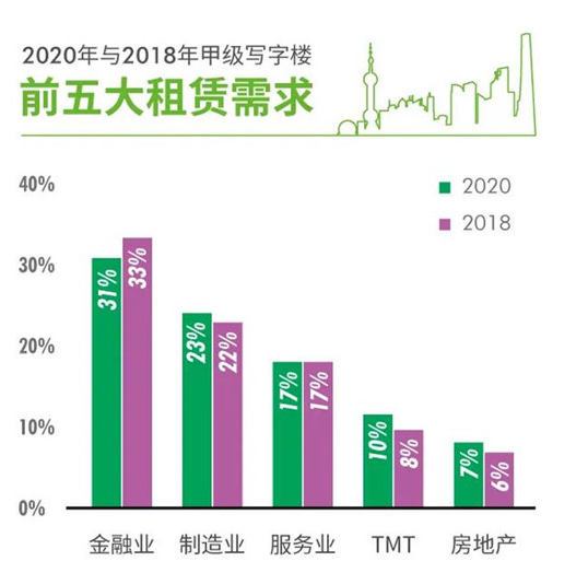 報(bào)告顯示,2020年金融業(yè)(31%)仍然是寫字樓需求首位,金融業(yè)持續(xù)領(lǐng)跑上海寫字樓租賃市場需求;此外高端制造業(yè)(23%)、服務(wù)業(yè)(17%)、TMT(10%)及房地產(chǎn)業(yè)(7%)等行業(yè)需求也持續(xù)攀升。
