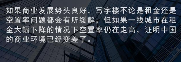 對此翟山鷹老師作出分析,事情發(fā)展的過程遠(yuǎn)比結(jié)果更重要,如果商業(yè)發(fā)展勢頭良好,寫字樓自然會被商家占領(lǐng),不論是租金還是空置率問題都會有所緩解,但如果連北上廣深這樣的一線城市,在租金大幅下降的情況下空置率仍在走高,證明中國的商業(yè)環(huán)境已經(jīng)變差了。