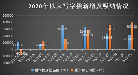 2020年全年,吸納面積小于新增面積。進(jìn)入2021年以來(lái),第一季度、第二季度,均錄得市場(chǎng)吸納面積大于新增面積,市場(chǎng)復(fù)蘇較為明顯。前兩個(gè)季度市場(chǎng)新增寫(xiě)字樓面積45.37萬(wàn)㎡,吸納面積76.37萬(wàn)㎡。