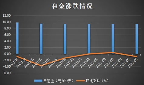 市場(chǎng)平均日租金在2020年一季度跌破10元/㎡/日以來(lái),總體上租金一直呈現(xiàn)環(huán)比下跌狀態(tài),在2021年第一季度出現(xiàn)環(huán)比上漲,但二季度又出現(xiàn)下跌,當(dāng)前主要表現(xiàn)為下跌收窄。2021年第二季度租金錄得平均值為9.38元/㎡/天。