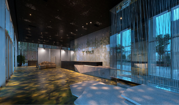 綠化層疊,宛如空中花園,大堂采用潑墨山水地面,每個(gè)辦公戶型都是全明采光,