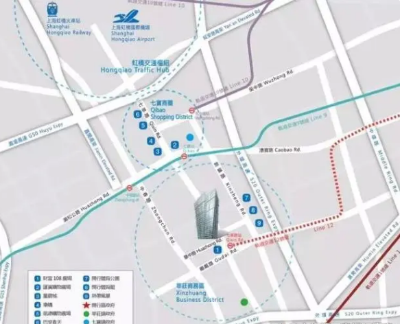 該地處于地鐵1、9、10、12號線以及多條公交線路的附近,與虹橋交通樞紐相連。此外,七莘路、中春路、顧戴路等多條主干道可直接通往G60高速、S4高速和S20高速。滬閔高架和其他快速通道的存在,使得該地交通網(wǎng)絡(luò)十分便利。